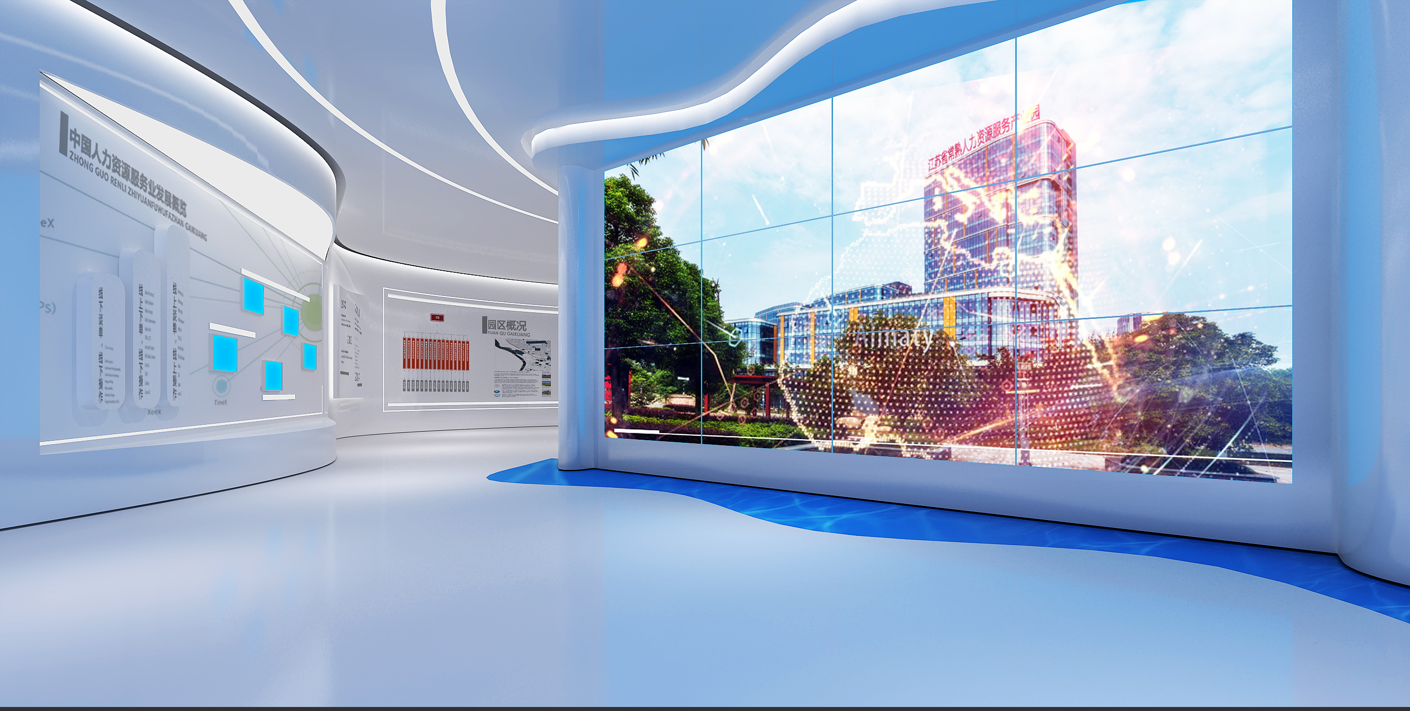根據(jù)人力資源服務(wù)產(chǎn)業(yè)園的特點,結(jié)合了江南元素水的特征,展示廳以流暢線型的造型風格,科技手法的運用,藍色,數(shù)字化,